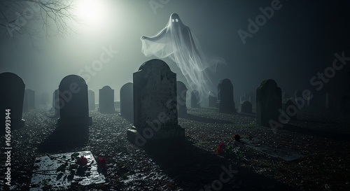 A spectral figure floats above a foggy graveyard, creating an eerie scene.