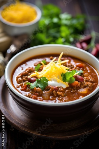 A spicy and flavorful chili soup with tender chunks of beef, beans, and a sprinkle of grated cheese