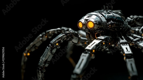 A spider-like robot with mechanical legs and glowing eyes, set on a plain black background