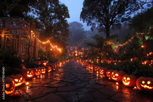 halloween, pumpkin, jack-o-lantern, garden, path, light, skittish, autumn, fall, night, festive, eerie, haunted, celebration, decoration, holiday, october, season, carving, glowing, party, orange, outdoors, landscape, tradition, dark, scarey, illuminated, cobbled, paseo, mystery, fog, misty, night scene, seasonal, garden path