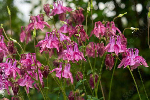 A spreading bush of hog aquilegia in the garden on a rainy summer day. Macro photography.