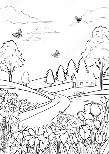 vector, illustration, outline, concept, advertising, banner, print, line, design, continuous, drawing, graphic, linear, vignetting, 1, art, symbol, icon, isolated, contour, single, black, springtime, blossom, spring, beautiful, floral, flower, natural, garden, nature, grass, growth, botany, field, meadow, plant, blooming, park, season, romantic, beauty, sun, summer, hill, mountain, butterfly, rural, home