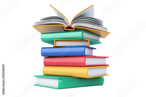 A stack of colorful books with an open book on top, showcasing various sizes and vibrant covers.
