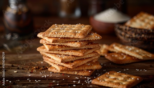 A stack of square crackers with sesame seeds on a rustic wooden table.