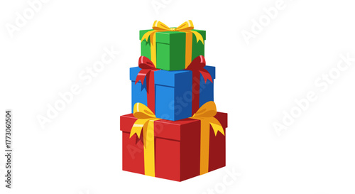 A stack of vibrantly colored present boxes tied with delicate ribbons, perfect for holiday season, birthday parties.