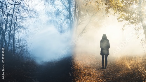 A stark contrast between a person breathing fresh air in a forest and someone struggling in a smog-filled urban area affected by PM 2.5.