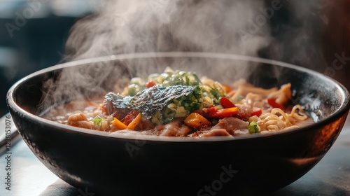 A steaming bowl of ramen topped with nori, pork, and fresh vegetables, perfect for showcasing a delicious, hearty meal