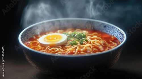 A steaming bowl of ramen with an egg and noodles coated in ketchup, set against a dark blue background illuminated with cinematic lighting, perfect for food advertisements or restaurant promotion.