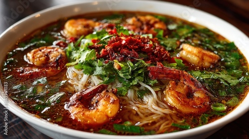 A steaming bowl of shrimp noodle soup features plump shrimp, delicate noodles, and a variety of fresh herbs and spices. The dish showcases a rich broth that enhances its flavors.