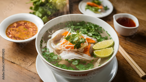 steaming, bowl, vietnamese, pho, fresh, herb, lime, slice, aromatic, rich, broth, noodle, flavorful, traditional, spicey, savoury, garnish, soup, comfort, hearty, texture, fragrant, healthy, delicious, warm, balance, light, spice, culinary, food, refreshing, comforting, cosy, indulgent, inviting