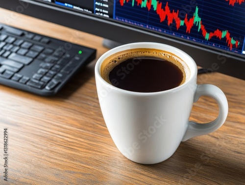 A steaming cup of coffee rests on a wooden table beside a computer displaying fluctuating stock market graphs