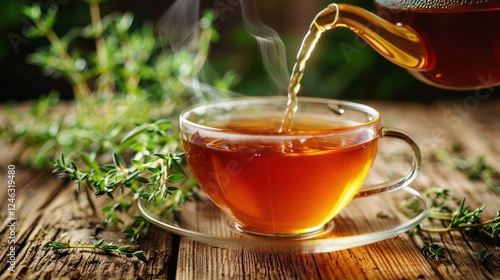 A steaming cup of herbal tea being poured from a teapot on a rustic wooden table