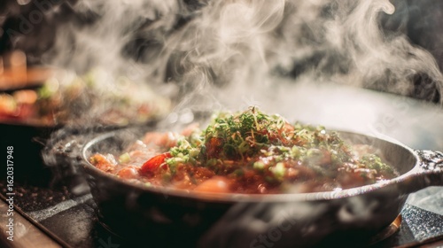 A steaming hot dish, smoke rising appetizingly from the freshly cooked food.