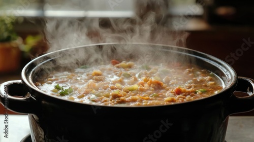 A steaming pot of soup releases vapor into the air as some of the water evaporates, capturing the warmth and comfort of a home-cooked meal