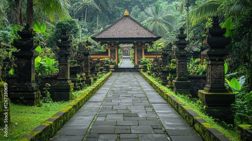 A stone pathway leading to a sacred temple, surrounded by lush greenery.