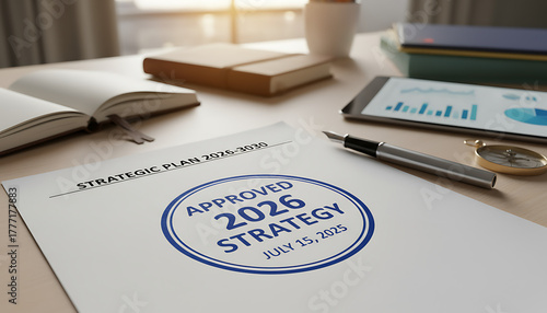 A strategic plan document with "Approved 2026 Strategy" stamped on it, resting on a desk alongside open notebooks, a tablet displaying charts, and a pen.