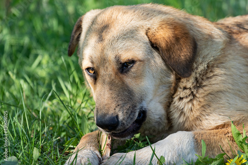 A stray dog lies on the grass and gnaws on a bone with a cunning and aggressive look. The problem of mongrels climbing garbage cans in search of food.