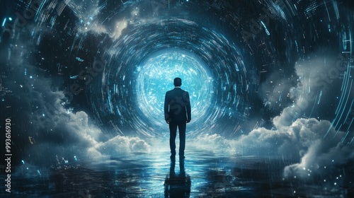 A stressed businessman stands inside the mind's silhouette, rain falling from clouds over him, surrounded by swirling data. Futuristic, glitch art, holographic blue hues, high-tech feel