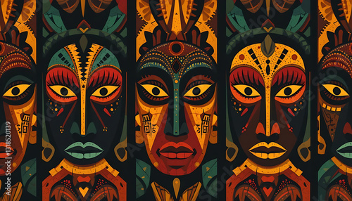 A striking African tribal mask pattern featuring bold, stylized faces with intricate geometric details. The design incorporates vivid colors such as deep black, rich red, warm yellow, and forest green