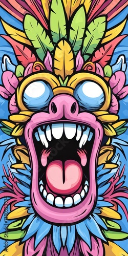 mythical, creature, colourful, art, foliage, pink, face, tropical, leaf, expressive, feature, design, bold, colours, graphic, illustration, artwork, exotic, fantasy, creativity, character, imaginative, nature, element, jungle, theme, playful, detailed, whimsical, display, fun, modern, visual, shape, unique, decorative, cultural, smile, open, mouth