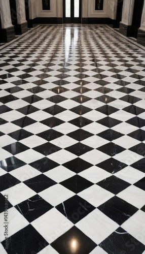 A striking black and white checkered floor featuring glossy marble tiles, creating a classic and elegant atmosphere in a spacious interior setting.