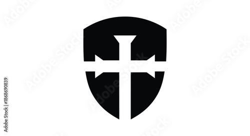 shield, cross, emblem, symbol, icon, design, graphic, vector, black, white, contrast, minimalist, modern, shape, abstract, silhouette, negative space, heraldry, religious, christian, armoring, protection, strength, defense, warrior, mediaeval, historic, vintage, classic, logotype, branding, identity, artwork, illustration, monochrome, simple, geometric, clean, graphic design, visual, representation, symbolic, powerful, bold, unique, distinctive