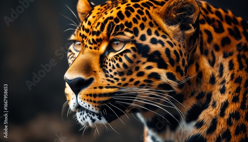 a striking close-up portrait captures the intense gaze and beautiful spotted coat of a majestic jaguar in soft, dramatic lighting.