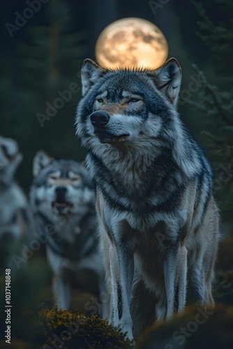 A striking gray wolf stands alert in a moonlit forest, showcasing its intense gaze beneath a glowing full moon, surrounded by its pack.
