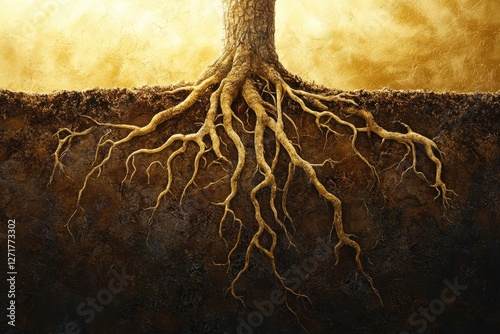 A striking illustration of a tree's roots extending into rich, dark soil beneath a golden sky, symbolizing strength and connection to the earth.