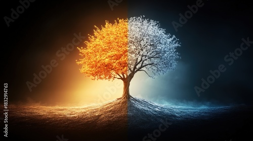A striking image of a tree bifurcated into warm orange and cool blue sections, set against a deep black background. The contrasting colors create a dramatic and surreal effect.
