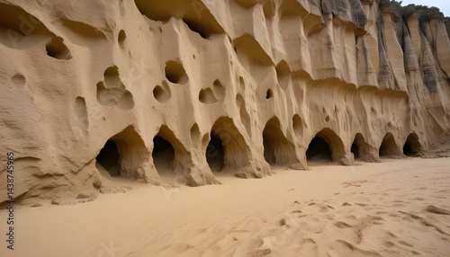 A striking image of sandstone cliffs showcasing natural erosion with cave-like formations on a beach.