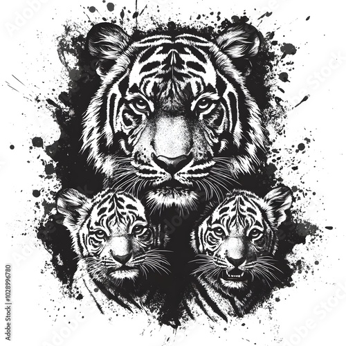 A striking monochrome illustration featuring a majestic tiger with two smaller tigers, surrounded by artistic splashes.