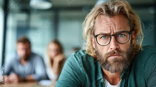 A striking portrait of a thoughtful man with a rugged beard and glasses, conveying emotions of concentration, seriousness, and introspection in a professional environment.
