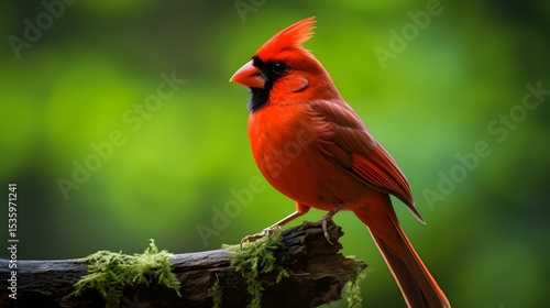 A striking red cardinal perched on a branch in lush green forest wildlife photography close-up view nature's beauty
