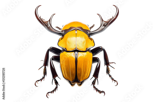 A striking yellow beetle with impressive horns, showcasing intricate patterns and textures.