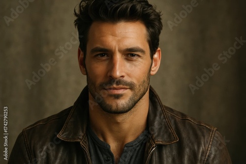 leather jacket, dark background, face, photogenic, guy, dark, model, person, serious, black, hair, fashion, people, expression, eye, boy, looking, beard, casual attire, youth, head, cool, man, look, confident, business, 1