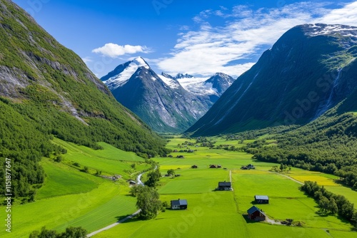 stunning, aerial, view, green, vale, surrounded, towering, mountain, dotted, small, village