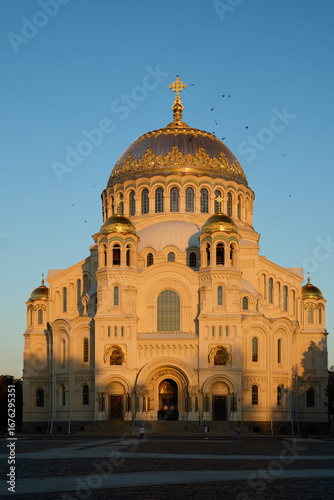 A stunning Cathedral adorned with Golden Domes beautifully illuminated during Sunset time
