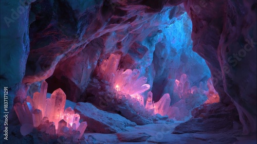 A stunning cave filled with glowing crystals creating an otherworldly atmosphere of light and beauty.