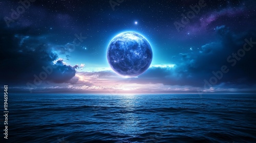A Stunning Celestial Sphere Glowing Tranquilly Above a Serene Ocean at Dusk, Illuminating the Night Sky and Creating a Dreamlike Atmosphere