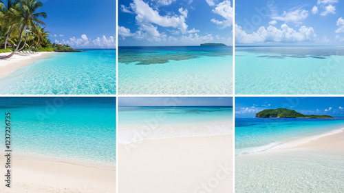 A stunning collage of tropical beaches with turquoise waters, white sand, and lush palm trees under clear blue skies.