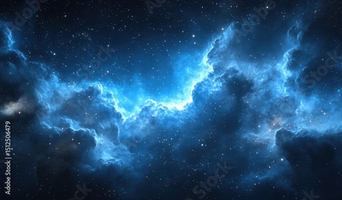 A Stunning Cosmic Nebula in Deep Space: The Majestic Blue and Black Swirls of Interstellar Gas and Dust Illuminated by Distant Stars