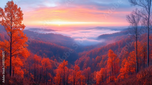 A stunning morning panorama reveals the forest cloaked in autumnal fog, with vibrant colors and the soft light of sunrise illuminating the hills.