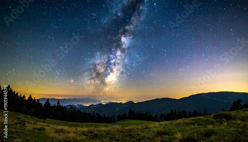 A stunning night sky displaying the Milky Way's brilliance above a serene mountainous landscape