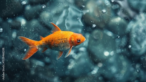 A stunning orange goldfish gracefully glides through an underwater world, showcasing its vivid colors against the backdrop of bubbles and rocks, embodying tranquility.