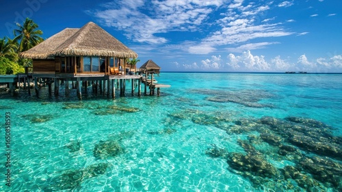 A stunning overwater bungalow with crystal-clear water