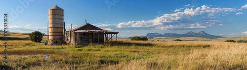 A stunning panoramic view of a rustic building surrounded by golden grasses and distant mountains under a clear blue sky.