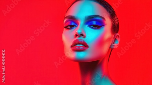 A stunning portrait of a model with vibrant makeup, featuring bold colors and dramatic lighting against a red background.