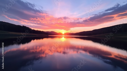 A stunning sunset over a tranquil lake, reflecting vibrant colors in the water, surrounded by lush hills and a serene atmosphere.