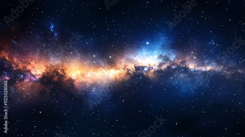 A stunning view of a vibrant galaxy filled with stars, cosmic dust, and deep blues and oranges.